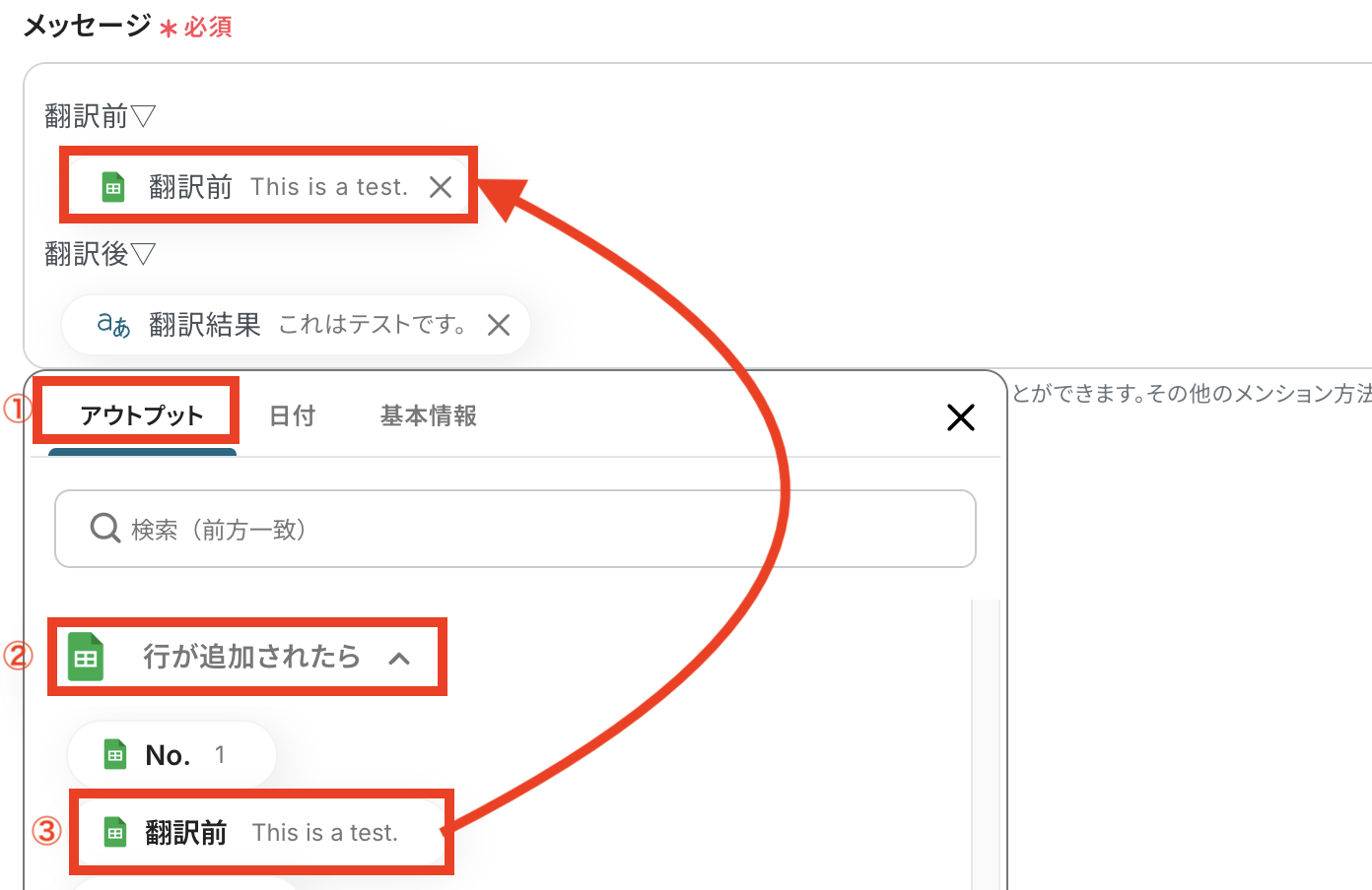 「翻訳対象のテキスト」をアウトプットを活用して入力します。 【アウトプットの活用方法】 ①入力欄をクリックして「アウトプット」を表示 ②「行が追加されたら」をクリック ③「翻訳前」を選択