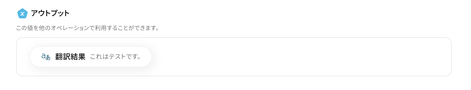 全ての項目の入力が完了したら「テスト」を押して、アウトプットとして「翻訳結果」が表示されていればOKです! 「保存する」をクリックしましょう。