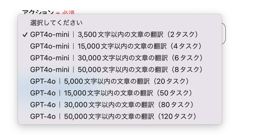 「タイトル」を必要に応じて変更して、「アクション」を選択します。 テキストの文字数やAIのモデルによって、消費するタスクの数が異なるので注意しましょう。 ※プランごとのタスク数は料金プラン をご確認ください。