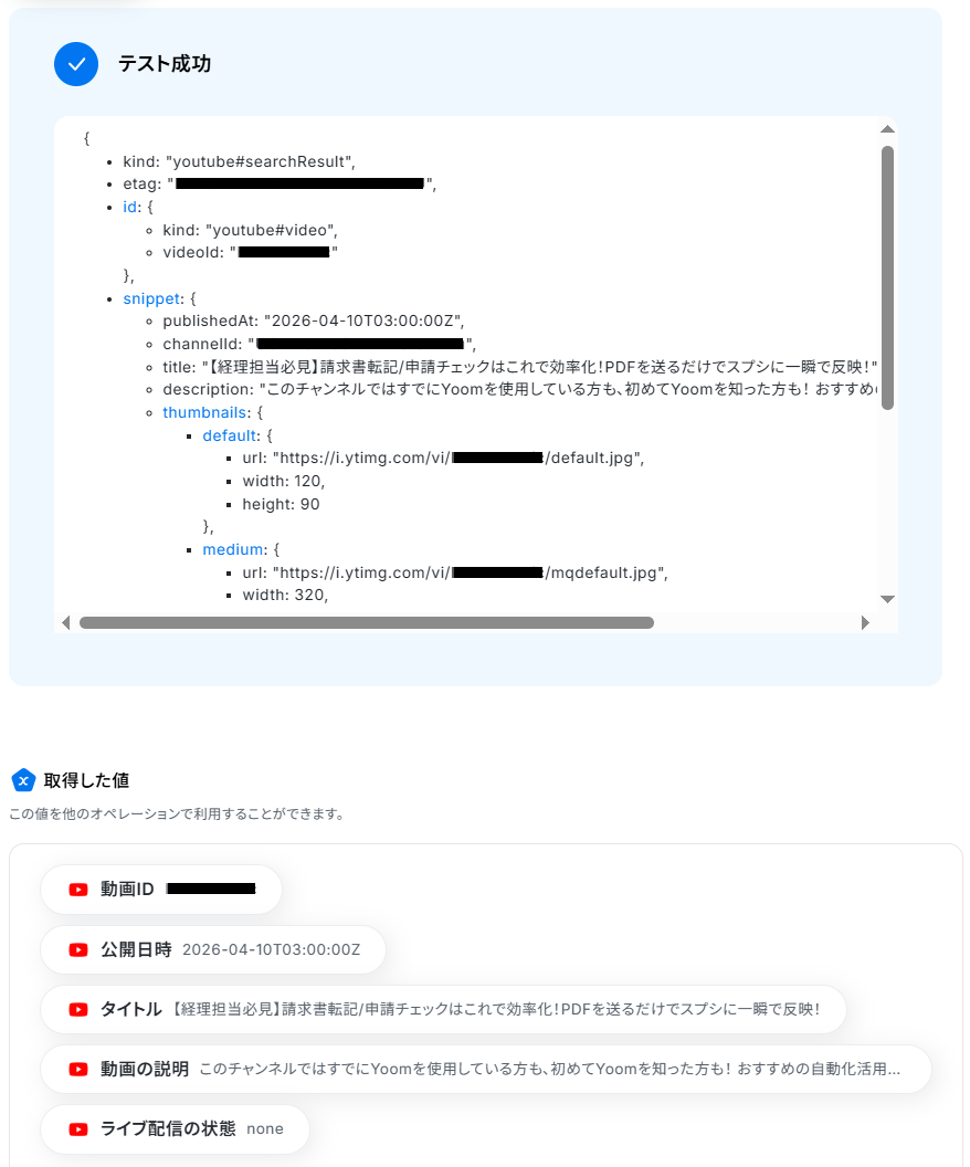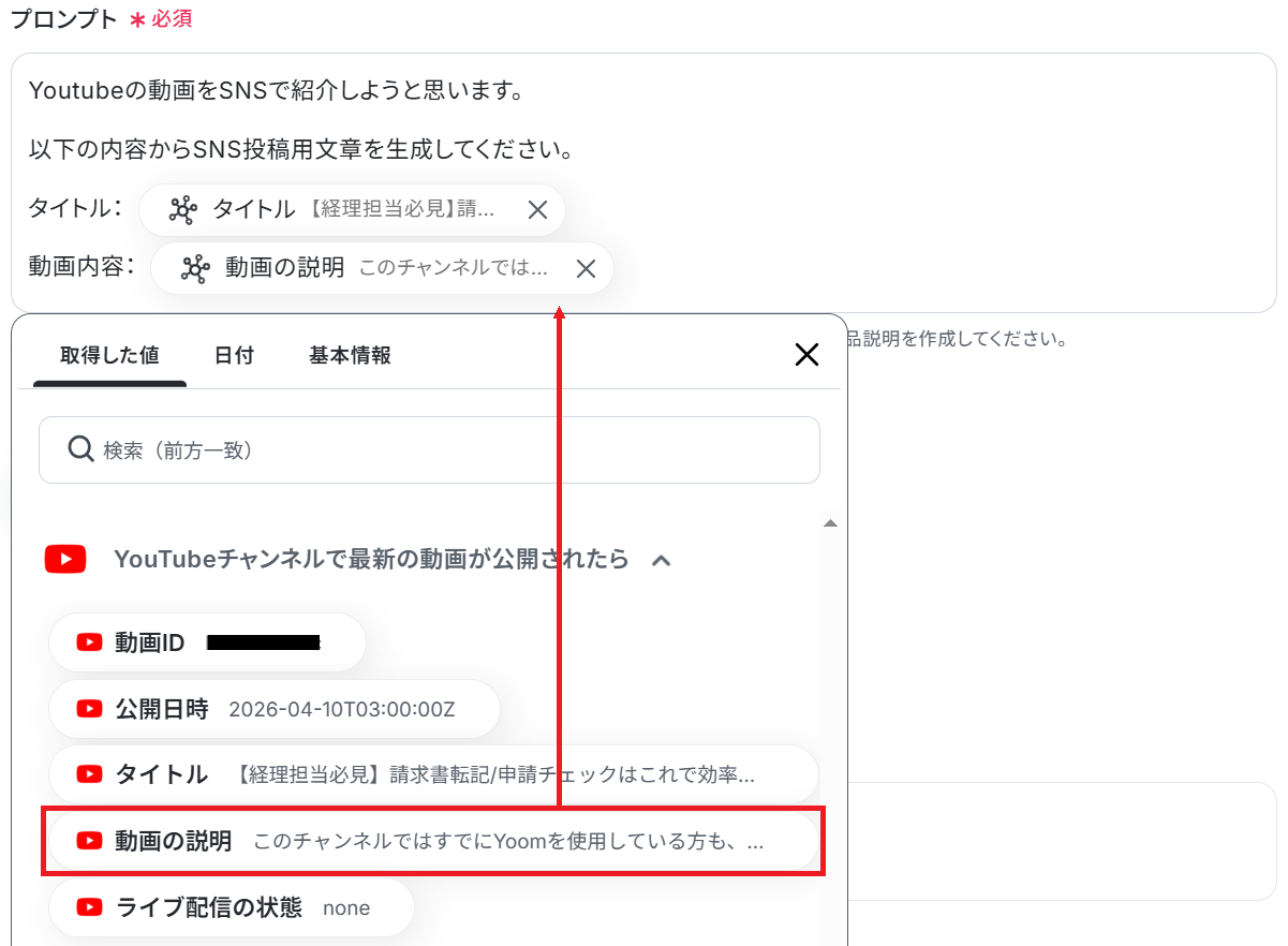 ※以下のように取得した値を設定することで、トリガーが実行されるたびに最新の動画情報を反映できます。