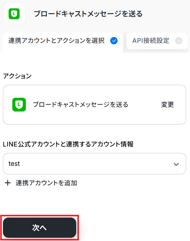 ステップ3と同様、アクションは「ブロードキャストメッセージを送る」のまま「次へ」をクリックします。