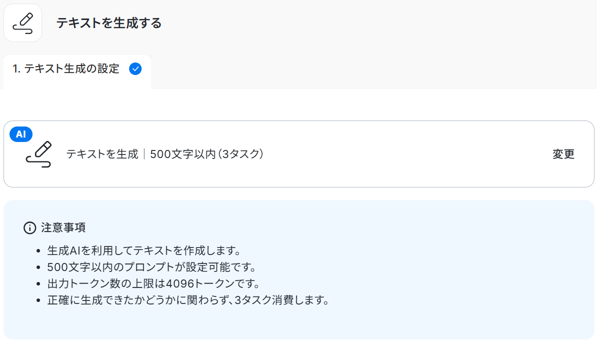 テキスト生成機能のアクションは以下のような種類がありますので、用途に合わせて選択しましょう。それぞれ()内のタスクを消費するため、使用プランやデータの容量にご注意ください。