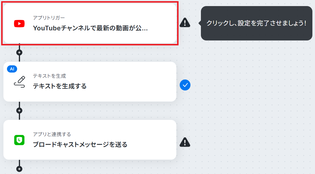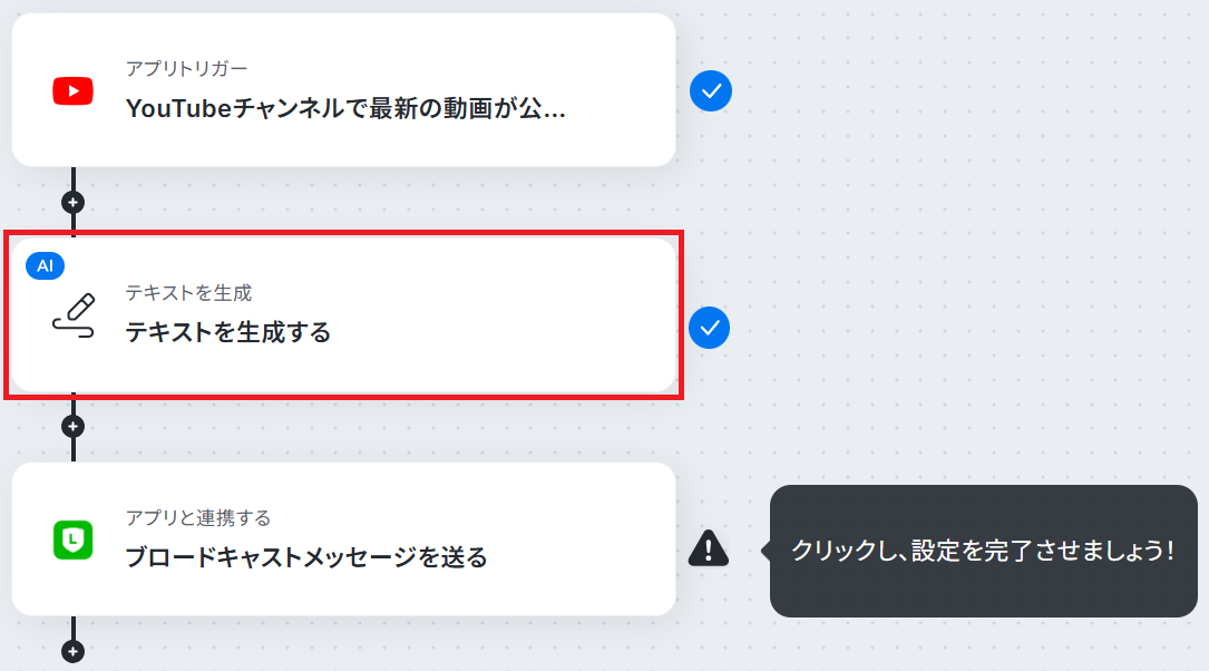 フローの作成方法 今回は、YouTubeで動画を公開したら、告知文をAI生成してLINEの友だち全員に送信する フローを作成していきます! 作成の流れは大きく分けて以下の通りです。