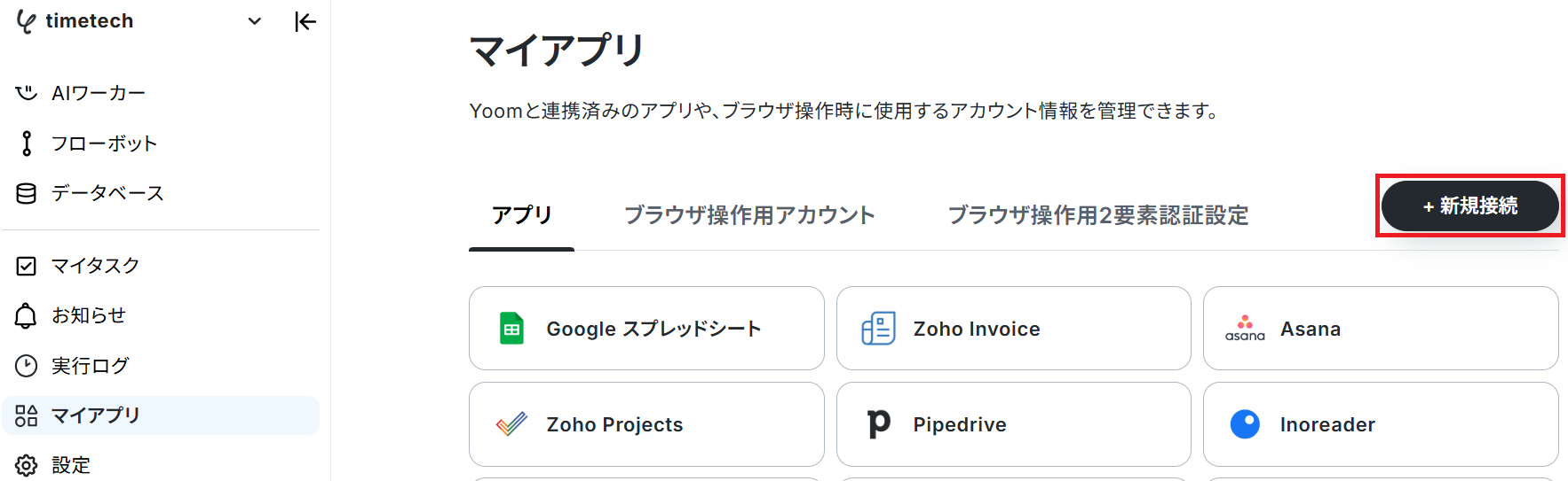発行できたらYoomのマイアプリ連携画面に移り「新規接続」をクリックします。