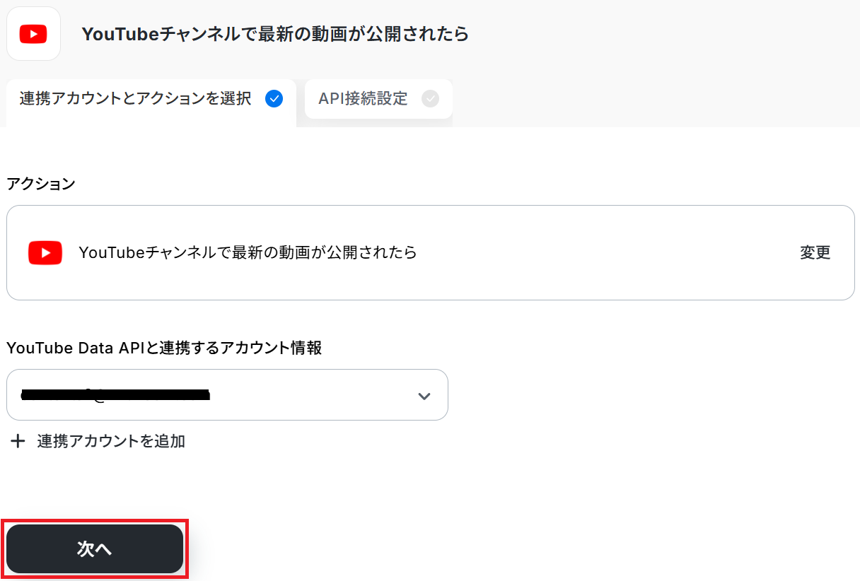 タイトル と連携するアカウント情報 を任意で設定し、アクションはテンプレート通りに「YouTubeチャンネルで最新の動画が公開されたら」のまま「次へ」をクリックします。