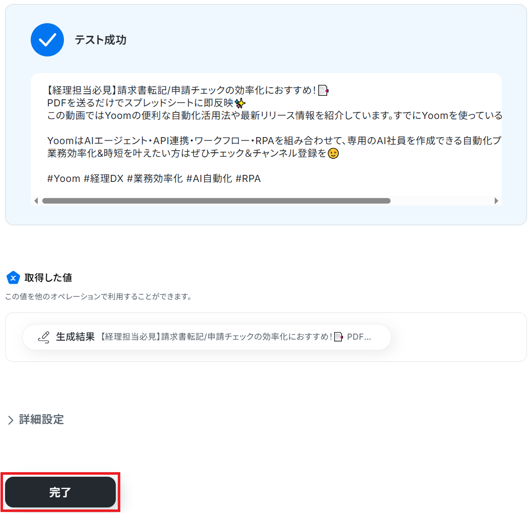 トリガーで最新動画の公開を検知するチャンネルのIDは、任意で設定可能です。 AI機能のテキスト生成オペレーションでは、動画の投稿文生成のプロンプトを自由にカスタマイズできます。 ■注意事項