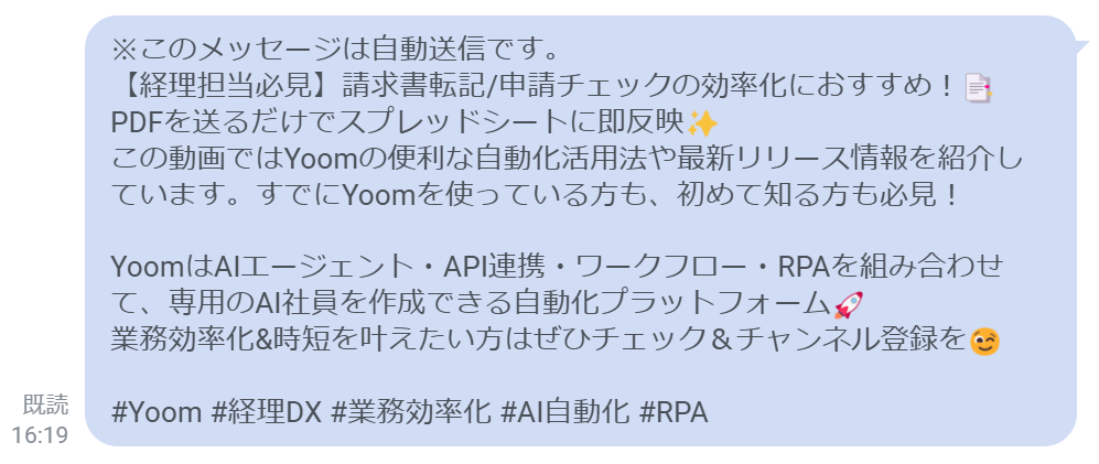 「新しいYouTube動画を公開するたびに、LINE公式アカウントで告知文を作成して配信するのが面倒…」 「文章作成から配信までの作業に時間がかかる上、配信ミスも心配…」