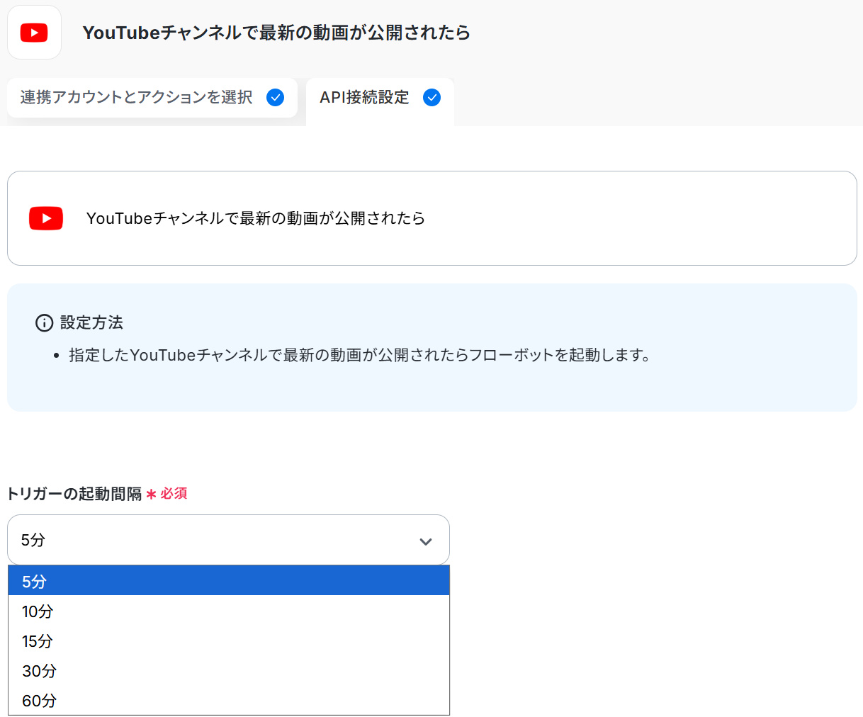 YouTubeとX(Twitter)を連携させてください。 トリガーは5分、10分、15分、30分、60分の間隔で起動間隔を選択できます。 プランによって最短の起動間隔が異なりますので、ご注意ください。