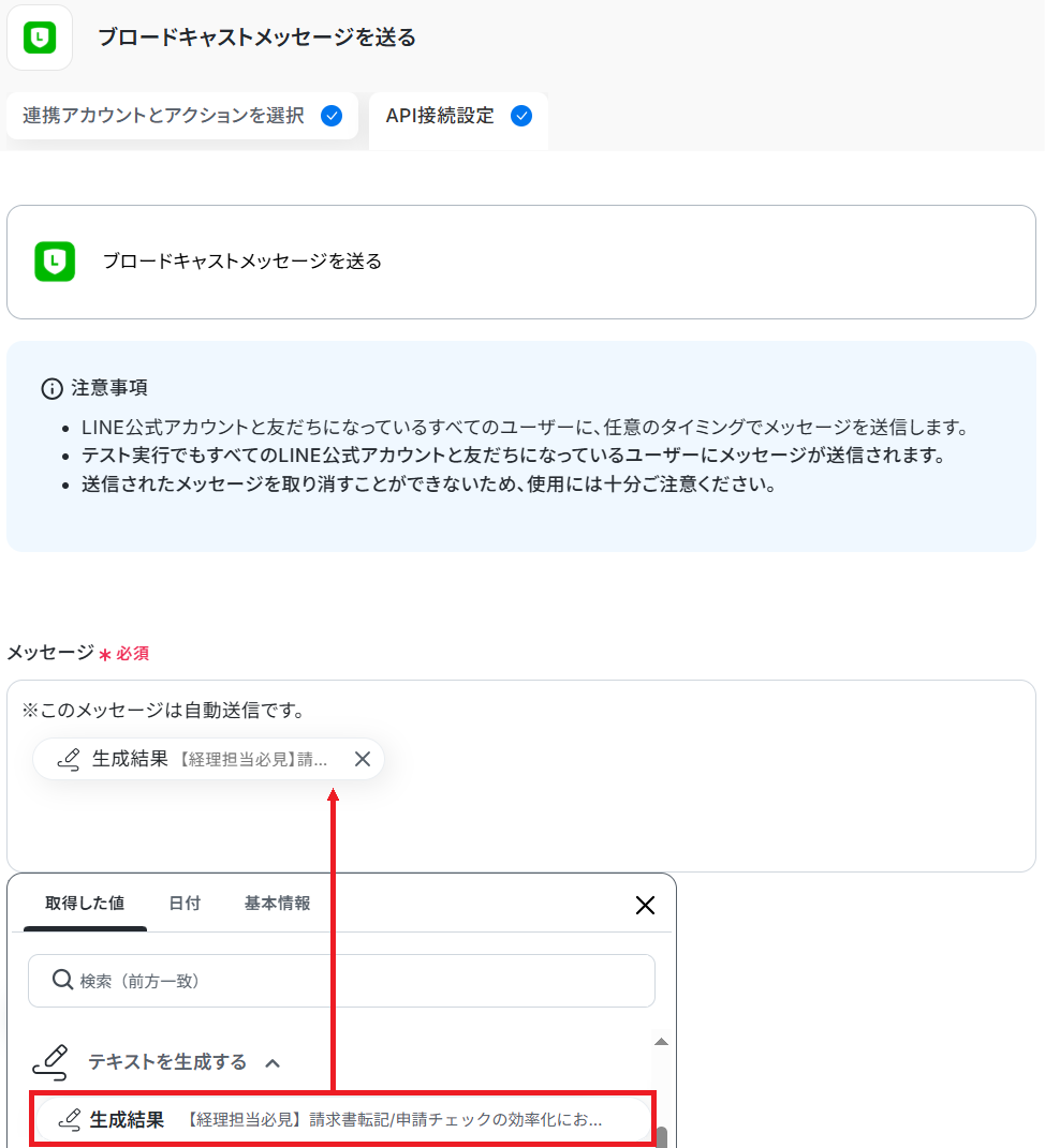 ステップ4と同じく、テキスト生成機能から取得した値や固定の文章を組み合わせてメッセージ を入力し、テストしましょう。