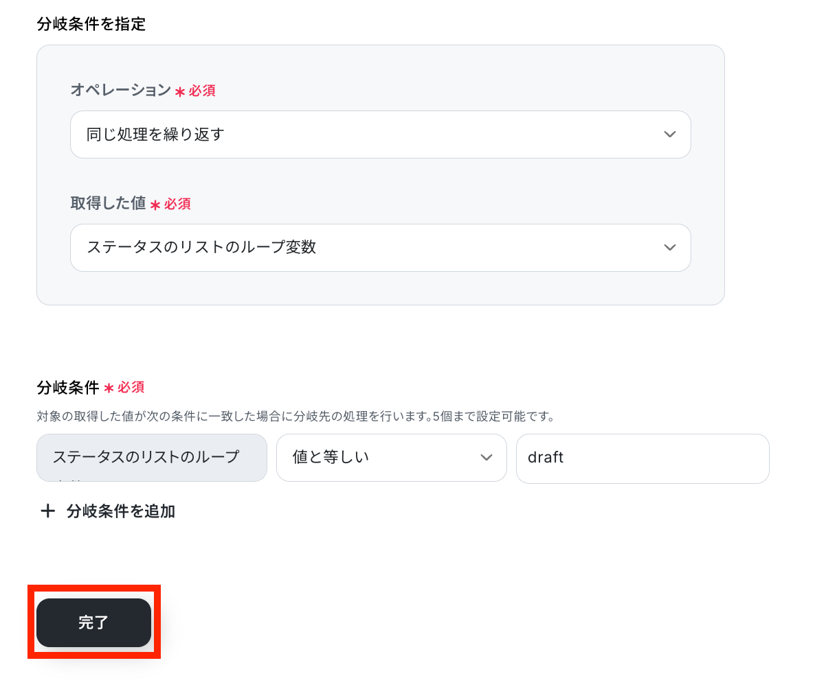 分岐条件も「darft」が設定されていることが確認できたら、「完了」をクリックして、分岐条件の設定は終了です。