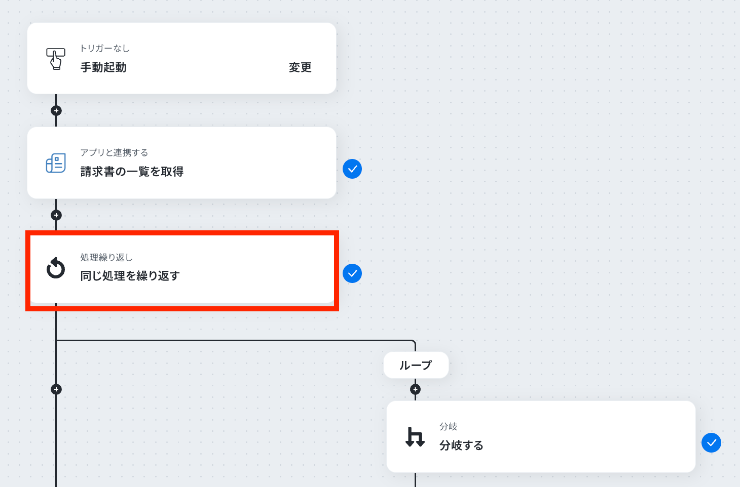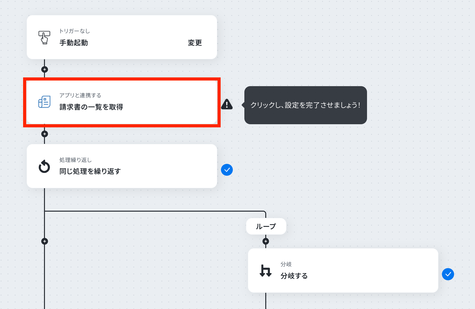 - 取得した請求書データ一つひとつに対して処理を行うため、「繰り返し機能」のオペレーションを設定します。