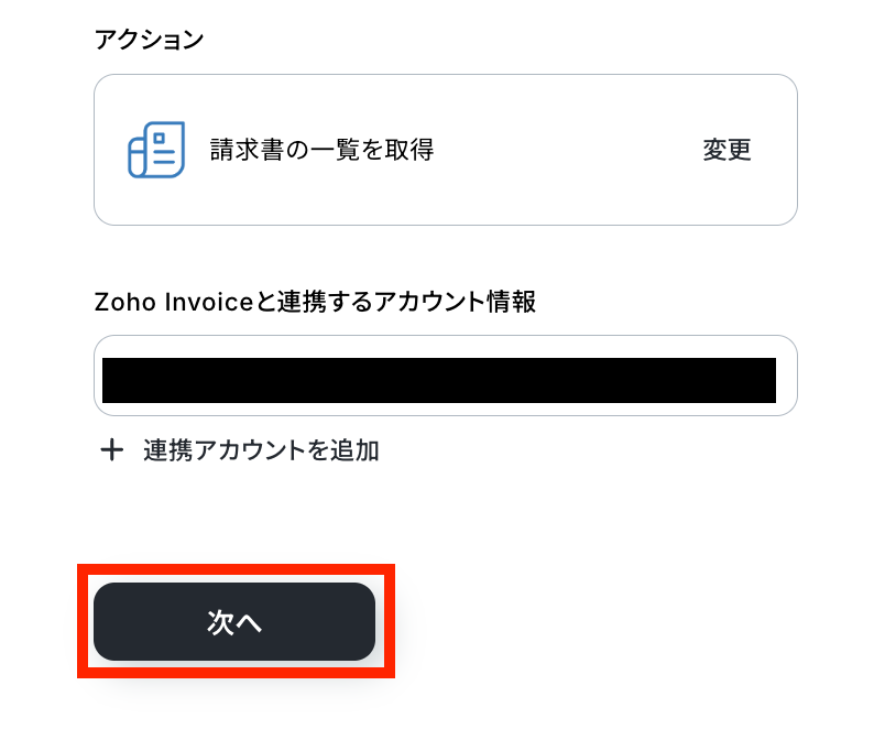 アクションは「請求書の一覧を取得」のままで、アカウントがしっかりと連携されていることが確認できたら、「次へ」をクリックして進んでください。