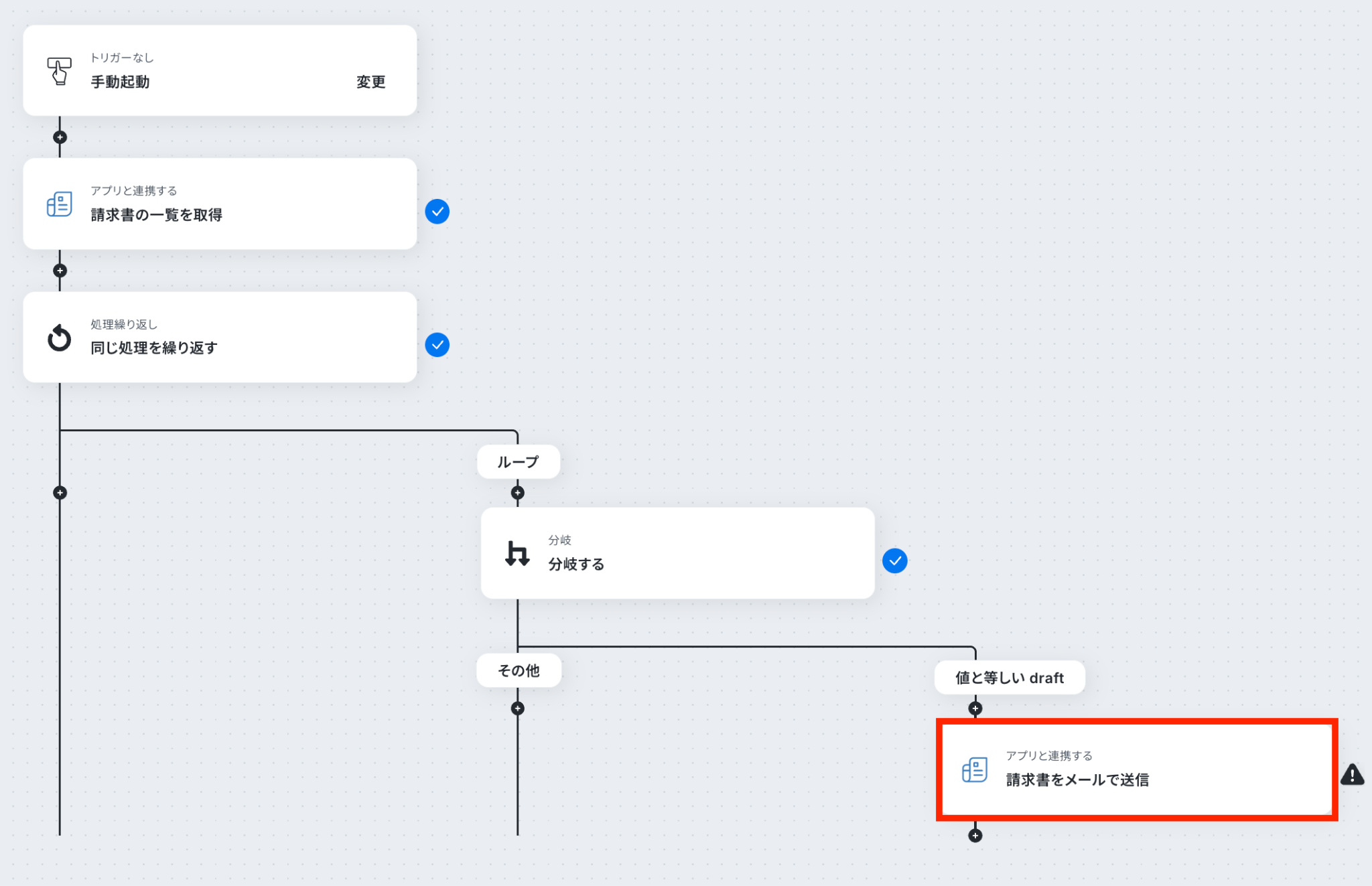 取得した値を用いて、請求書をメールで送信する設定を行います。次の赤枠をクリックしましょう。