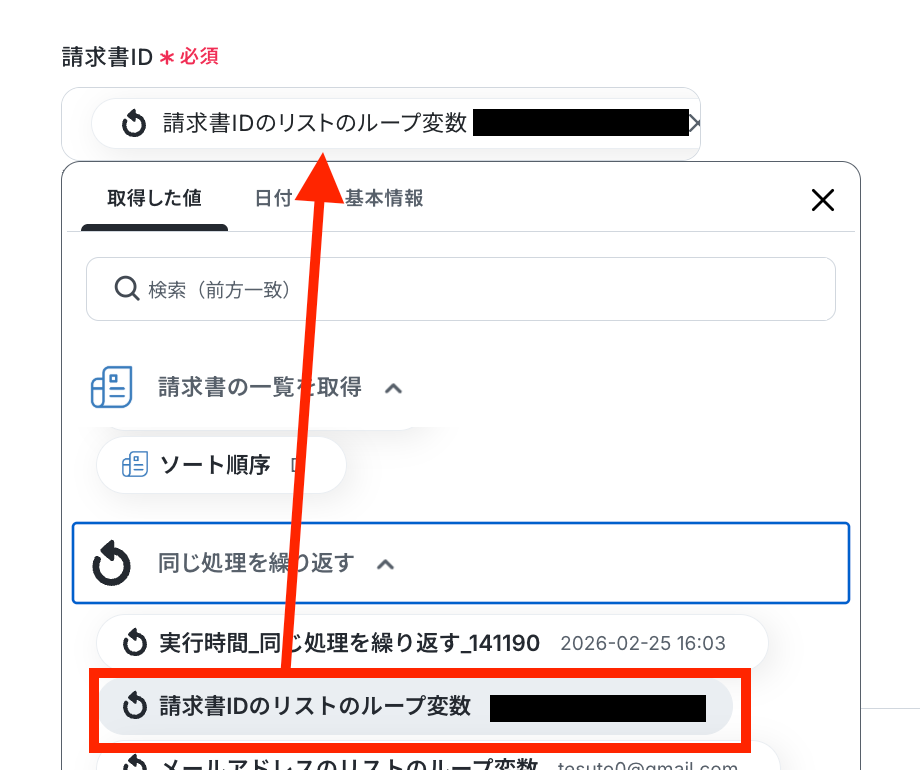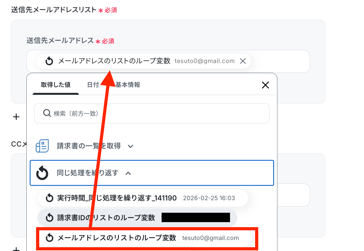 送信先メールアドレスリストにも、「同じ処理を繰り返す」の項目をクリックして、取得した値を選択します。