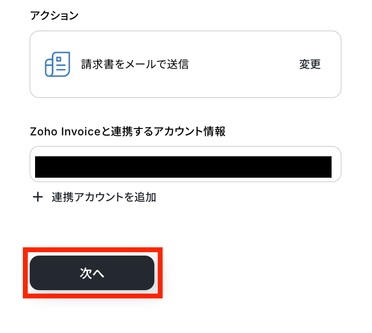 アクションは「請求書をメールで送信」のままで、連携するアカウント情報を確認します。