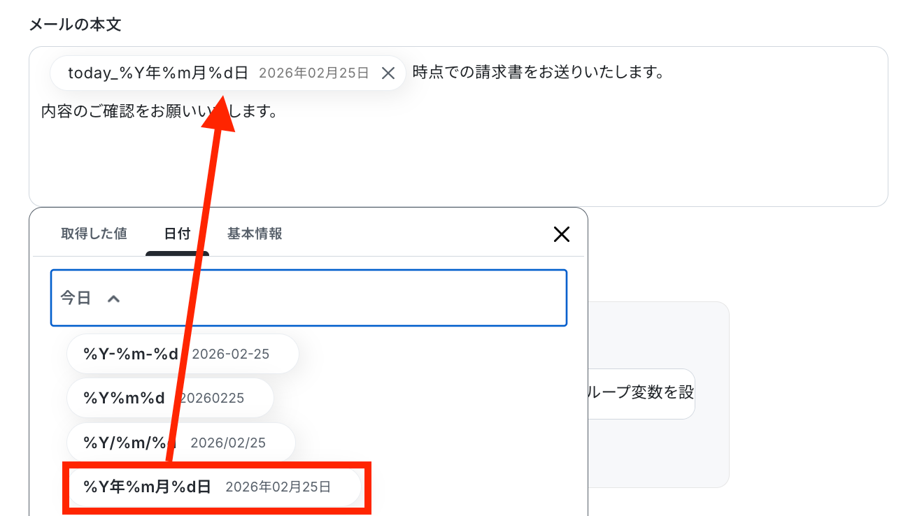 そのほかも任意で設定していきましょう。メールの本文には日付を入れ込むことも可能です!
