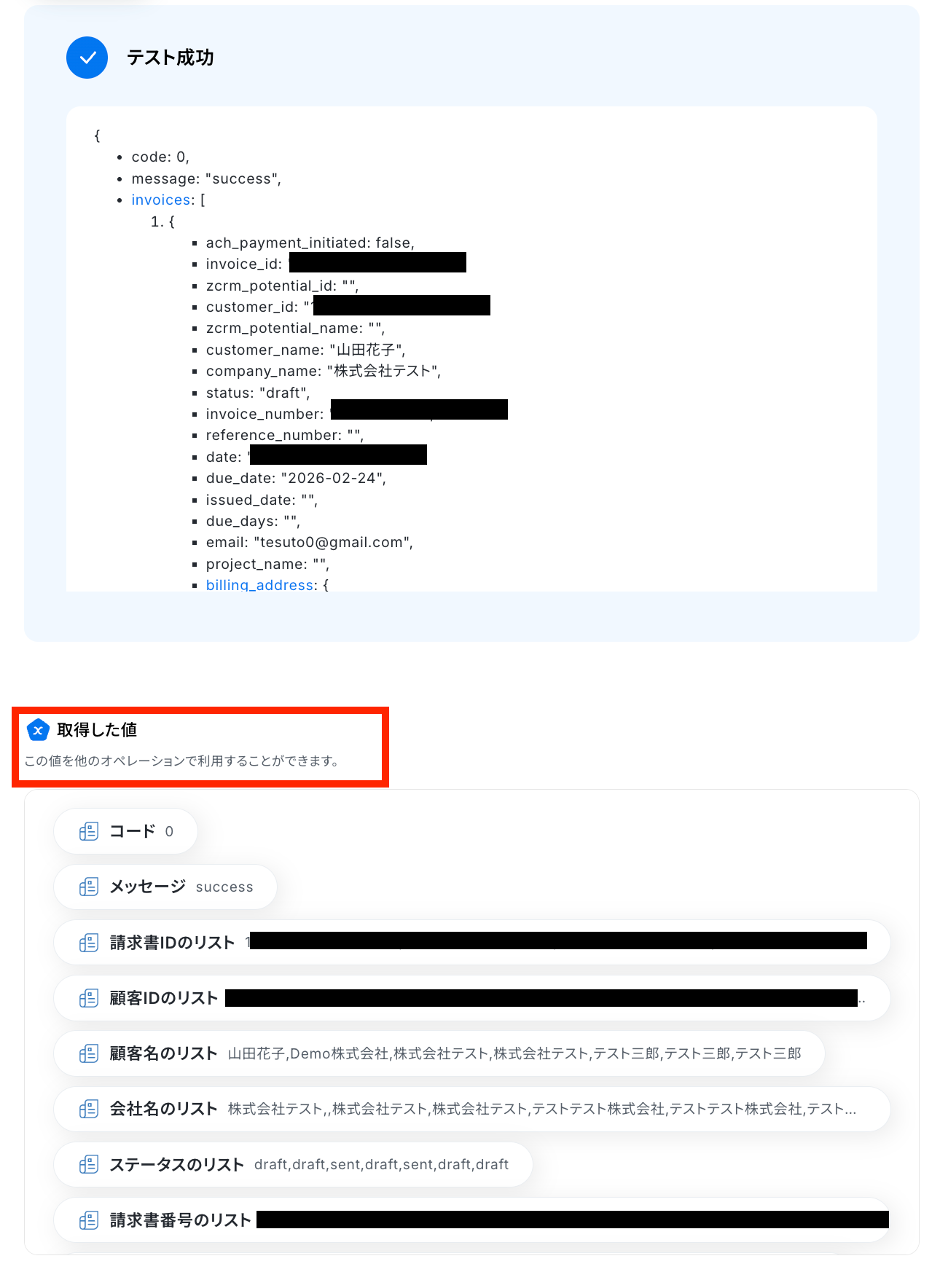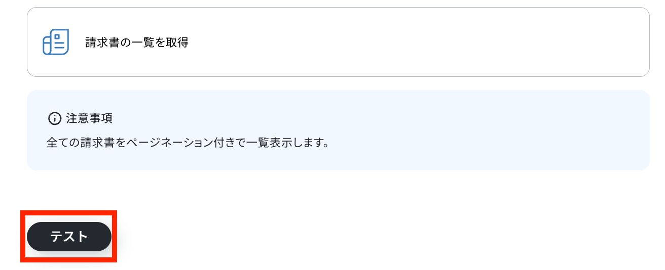 Zoho Invoiceの請求書を取得します。「テスト」ボタンをクリックしましょう!