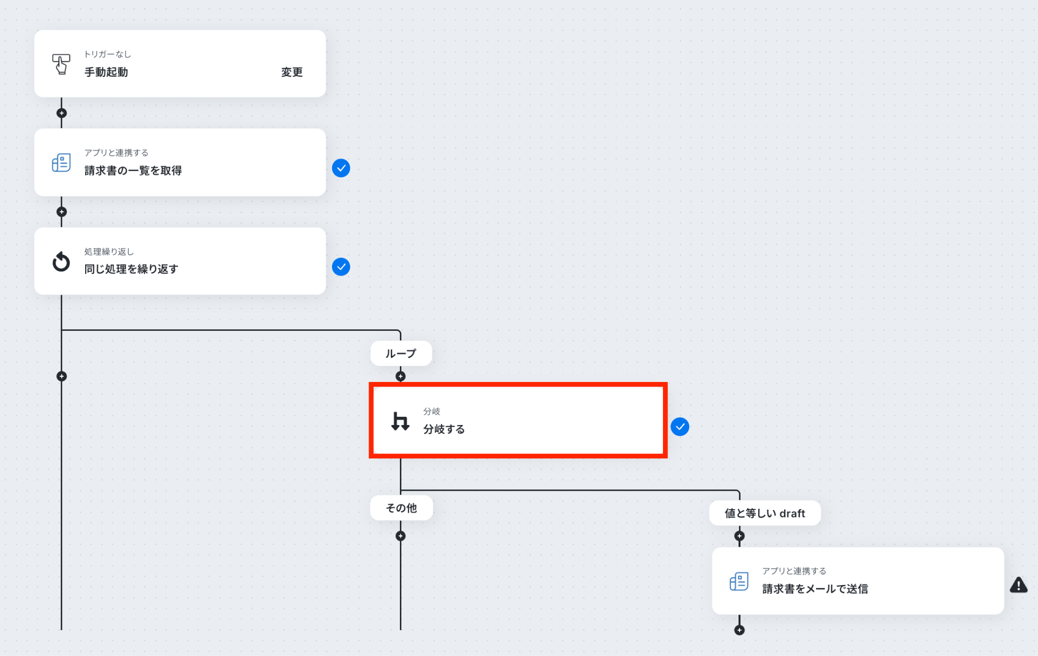 - さらに、「分岐機能」のオペレーションを設定し、ステータスが下書き(draft)の請求書のみを送信対象とするよう設定します。
