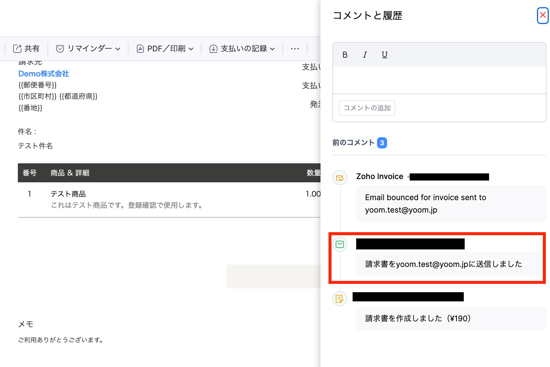テスト成功で、請求書が送信されています。Zoho Invoiceを確認してみましょう!