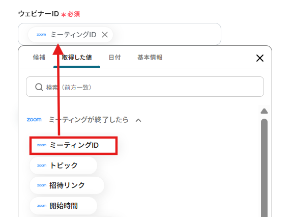 4.「ウェビナーID」は先ほど取得したアウトプットから「ミーティングID」選択します。