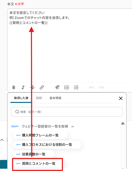 - 「本文」→任意の内容とアウトプットから選択可能です。
