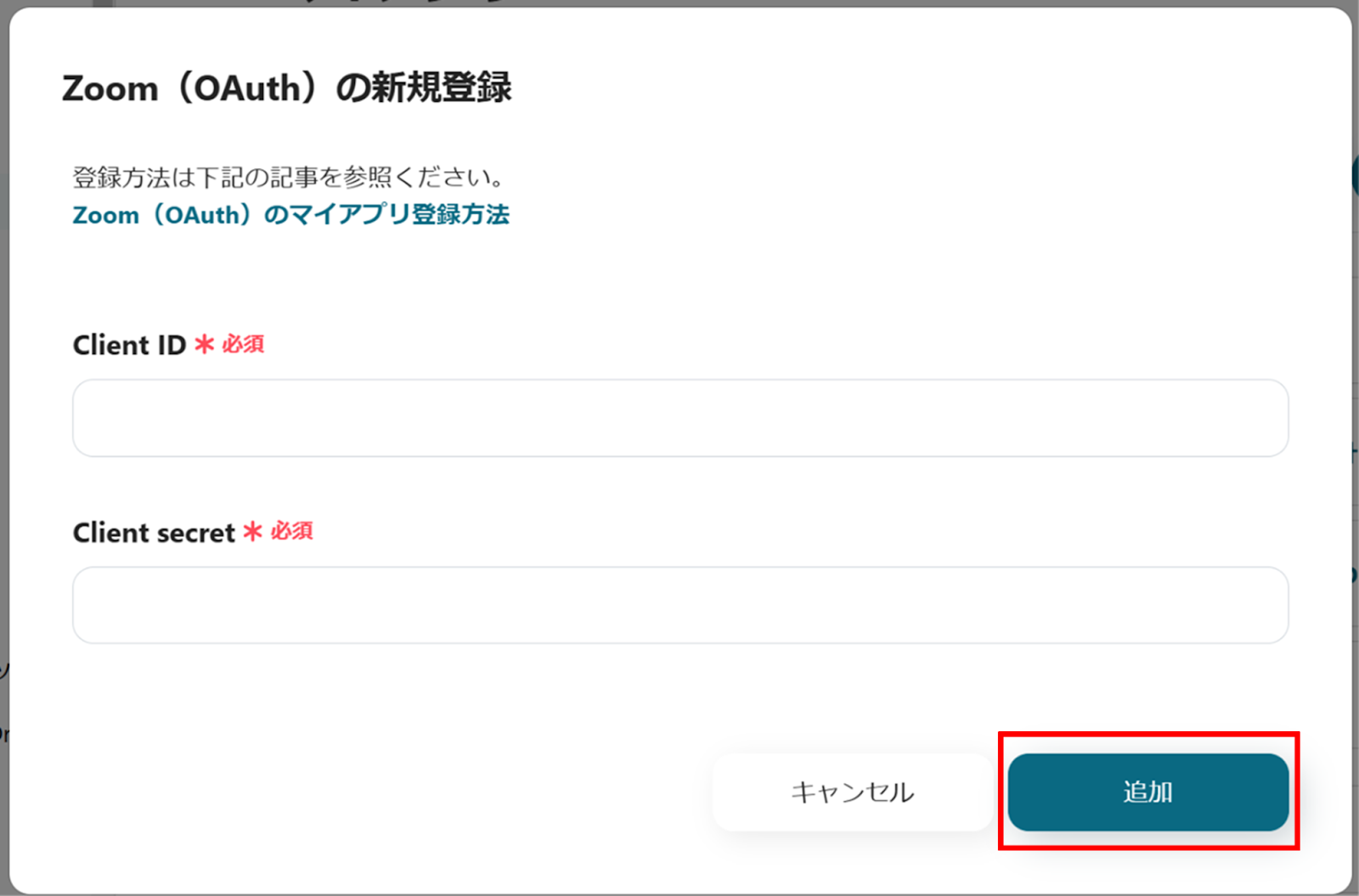 先ほどのマイアプリ画面に戻り、今度はZoomを検索してください。Zoom(OAuth)の新規登録画面が表示されたら、必須項目を入力し、「追加」ボタンをクリックしてください。