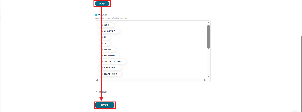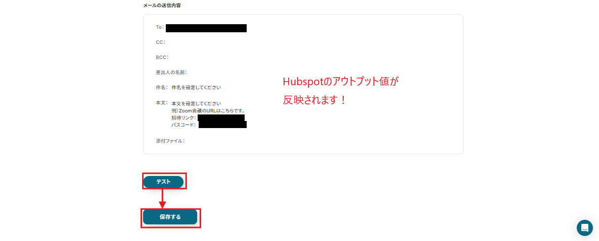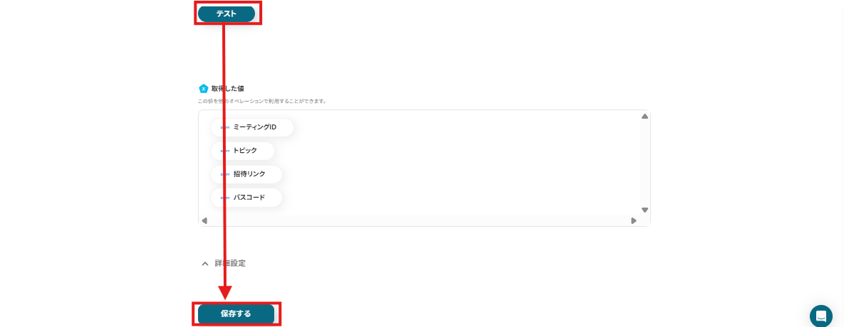 テストが成功したら先ほどHubSpotで作成したミーティングの情報がアウトプットに取得されるので、確認後「保存する」ボタンを押しましょう。