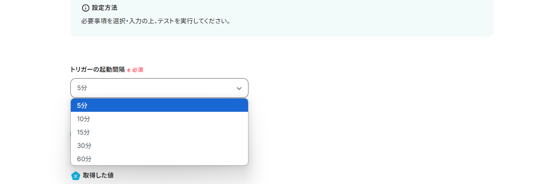 トリガーの起動タイミングは、5分、10分、15分、30分、60分から選択できます。