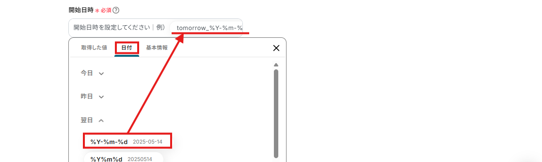 開始日時は、下記画面のように明日の日付が自動取得されるように設定されています。