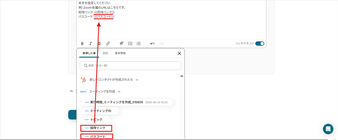 - HubSpotのトリガー設定とZoomミーティング情報を使ったメール送信のアクション設定