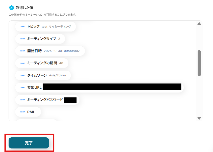 Zoomでミーティングを作成したらテストボタンを押します。テストが成功し、取得した値が入ればOKです。