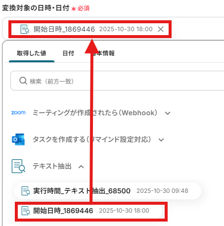 変換対象の日時・日付の欄は、取得した値より前段階で整形・抽出した「開始日時」を入力してください。