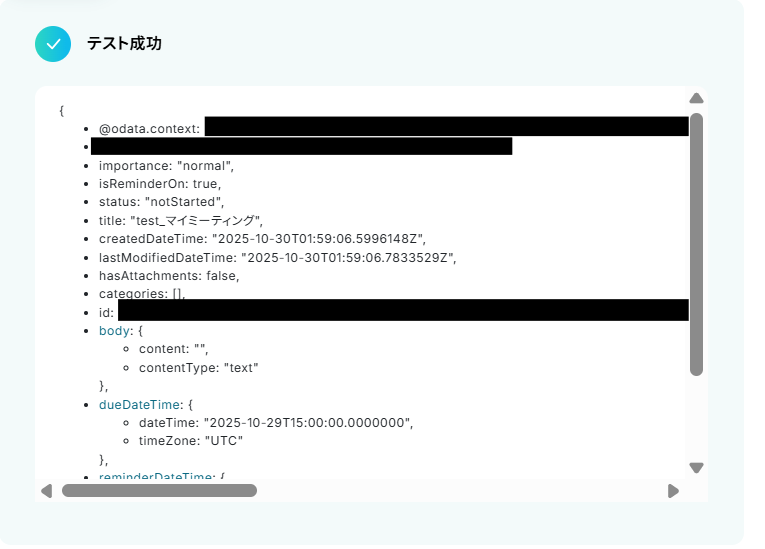 上記設定が完了したらテストボタンを押します。テストが完了し、取得した値が「リマインドを行いたい時刻」になっているか確認してください。