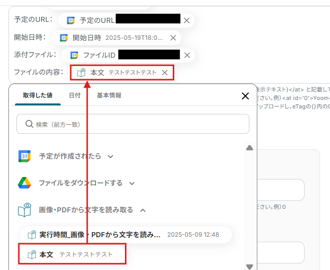Google カレンダーの予定に添付された画像ファイル(例えば、スキャンした書類やスクリーンショットなど)に含まれる文字情報をOCR機能で抽出し、そのテキストデータをMicrosoft Teamsに通知するフローです。