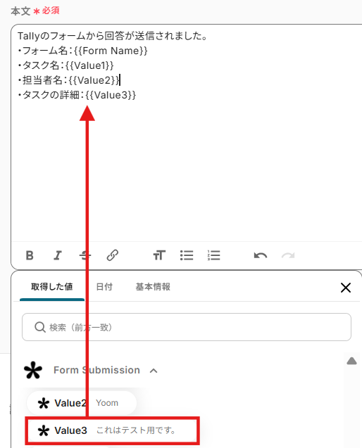 最後に、入力したい値をステップ3で取得したTallyのデータを埋め込み、設定は完了です。