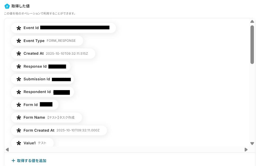 トリガーやオペレーション設定時に、「テスト」を実行して取得した値のことを指します。