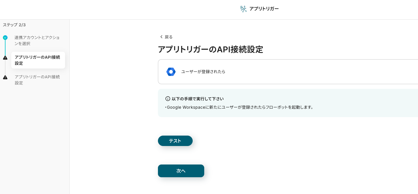 テンプレートの1つ目の工程をクリックし、フローボットのトリガー(起点)を設定します。この工程では、Webhookを使ってGoogle Workspaceに新しく追加されたユーザーを検知する設定を行います。