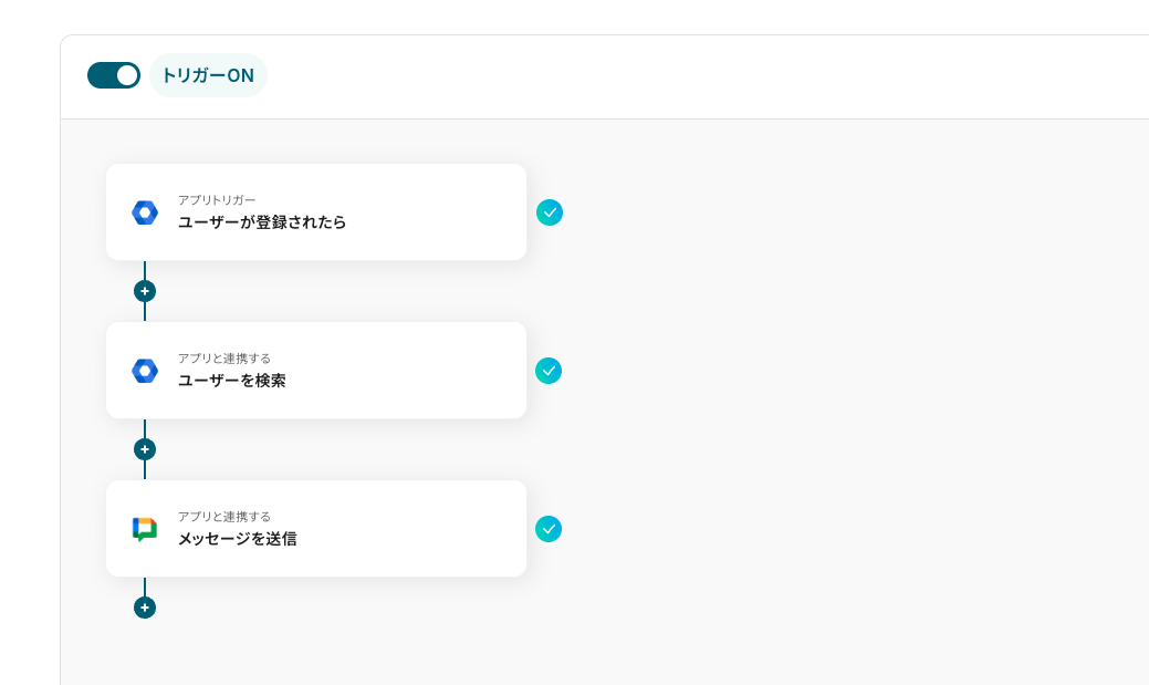 Google Workspaceでのユーザー登録をトリガーとして、Google Workspace チャットをはじめ、SlackやDiscordといった様々なビジネスチャットツールへ新ユーザー情報を自動で通知することができます。