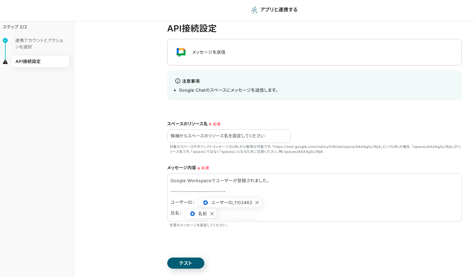 定型文が編集できたら、テストボタンをクリックします。成功するとGoogle Chatのスペースに通知されます。