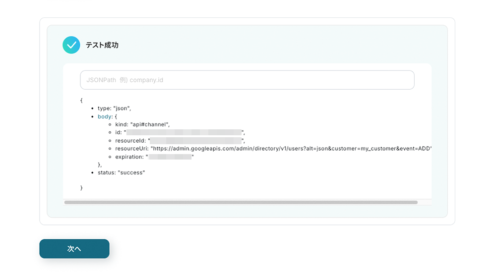この結果は、「Google Workspaceでユーザーが追加されたときに通知を受け取る設定(Webhook)」が正常に登録・接続されていることを示しています。