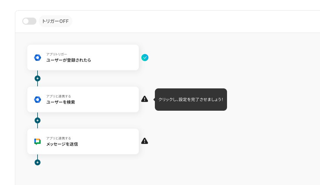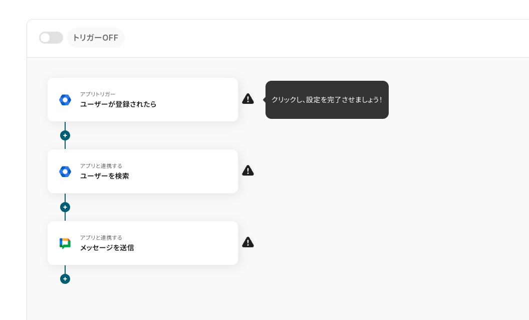 新しいメンバーが加わる際、Google Workspaceへのユーザー登録後に、関係者へ手動で通知するのは手間がかかる作業ではないでしょうか。この作業は単純でありながらも、対応漏れや遅延が発生すると、その後のオンボーディングに影響を及ぼす可能性があります。このワークフローを活用すれば、Google Workspaceにユーザーが登録されたことを検知し、自動でGoogle Chatに通知を送信できるため、こうした課題を解消し、スムーズな情報共有を実現します。