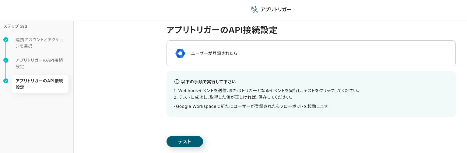 いきなりテストボタンが表示されていますが、このテストは、Google WorkspaceのDirectory APIを使って「ユーザー情報の変更や追加などのイベントをリアルタイムに検知するWebhook通知の設定」が正しく行われるかどうかを確認するものです。