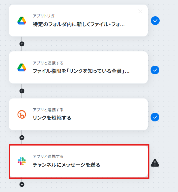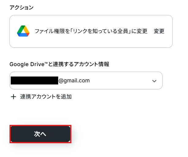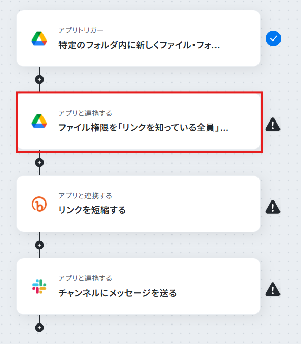 ステップ4:Google Driveのファイル権限を変更する設定 次にGoogle Driveのファイル権限を、リンクを知っている全員に変更するアクションを設定していきます。 フローに戻り、「ファイル権限をリンクを知っている全員に変更」をクリックしてください。