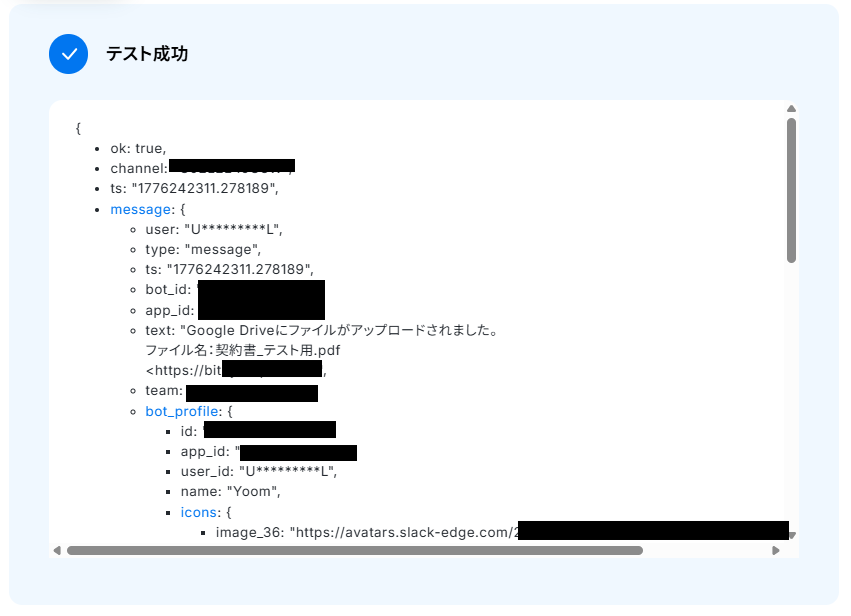 入力が完了したら、「テスト」をクリックします。 テストが成功したら、Slackも確認してみましょう!