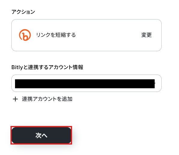 ステップ5:Bitlyでリンクを短縮する設定 次にBitlyでリンクを短縮するアクションを設定していきます。