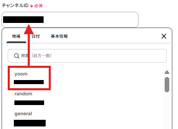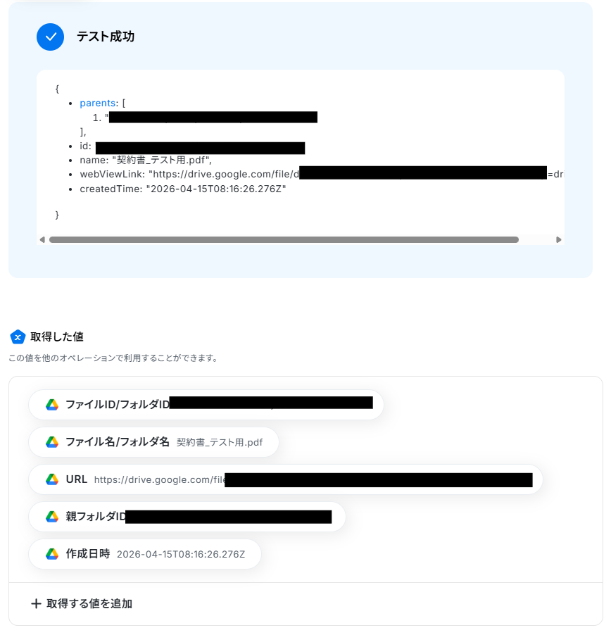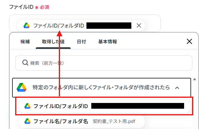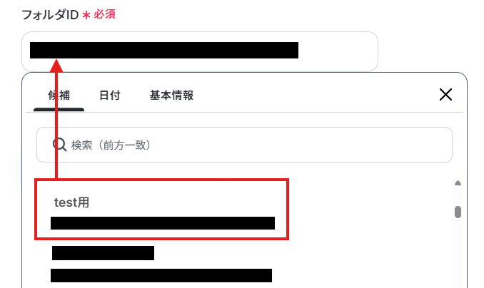 フォルダIDはボックスから先ほどステップ3で取得した値を選択してください。 取得した値を活用することで、固定値ではなく、トリガーが実行されるたびに最新の情報が反映できます。デフォルトで設定されていますが、【取得した値から選択してください|例)】という補足文は削除して設定してください。