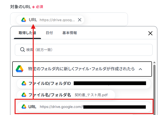 対象のURLは、ボックスからステップ3で取得した値を選択してください。