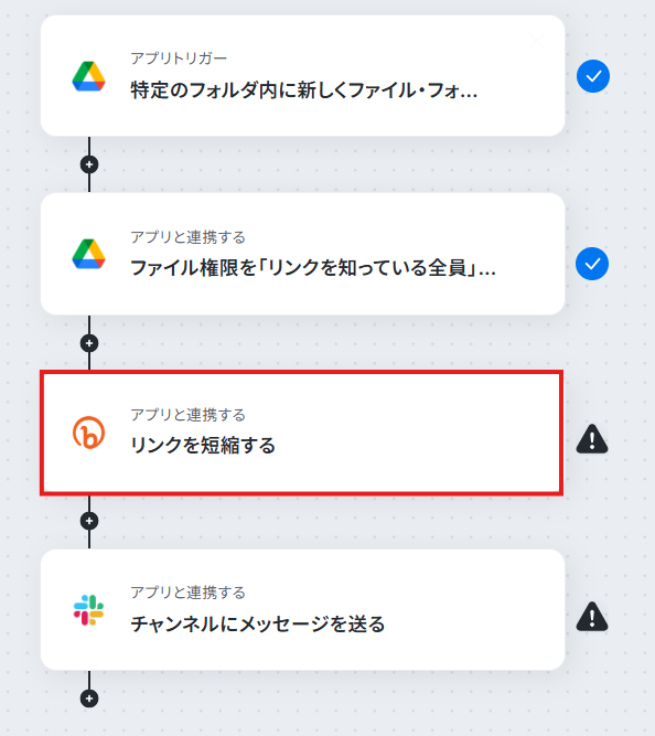 はじめに、Bitly、Google Drive、SlackをYoomと連携します。 次に、トリガーでGoogle Driveを選択し、「特定のフォルダ内に新しくファイル・フォルダが作成されたら」を設定します。 続けて、オペレーションでGoogle Driveの「ファイル権限を「リンクを知っている全員」に変更」アクションを設定し、ファイルを共有可能な状態にします。 次に、オペレーションでBitlyの「リンクを短縮する」アクションを設定し、Google Driveで取得したファイルリンクを短縮します。 最後に、オペレーションでSlackの「チャンネルにメッセージを送る」アクションを設定し、生成された短縮URLを含んだメッセージを送信します。 ※「トリガー」:フロー起動のきっかけとなるアクション、「オペレーション」:トリガー起動後、フロー内で処理を行うアクション■このワークフローのカスタムポイント