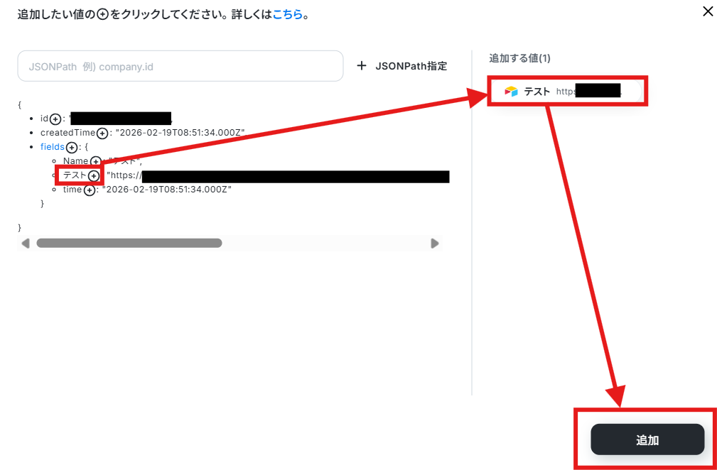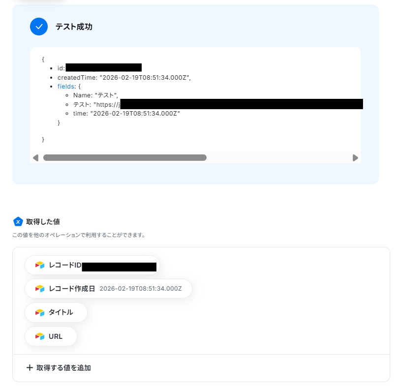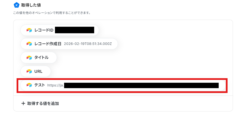 入力ができたら「テスト」ボタンを押してみましょう。連携が成功すると以下のように取得した値が入りますが、このままではURLが取得できていません。