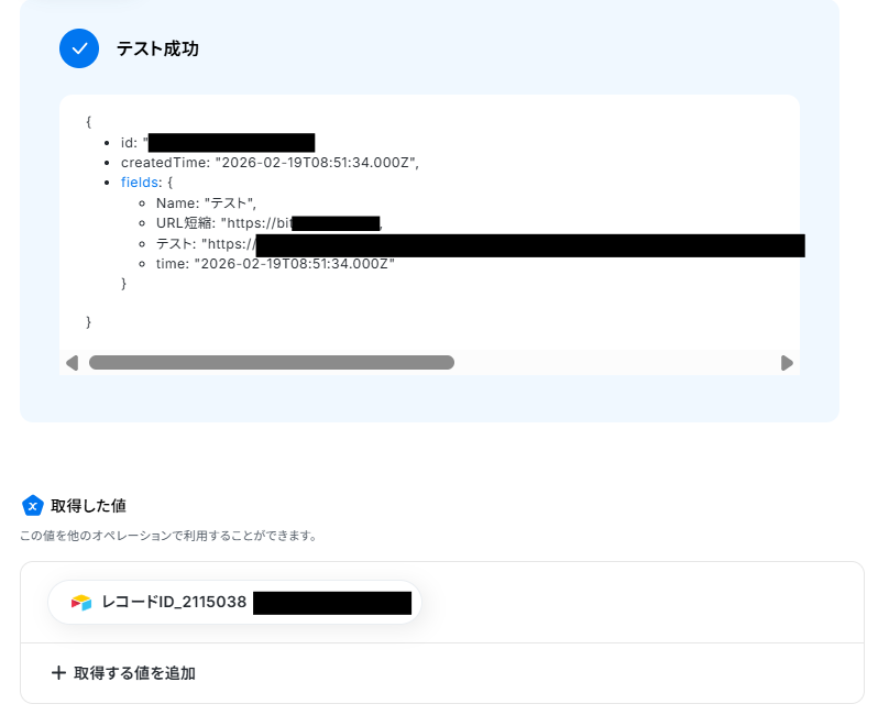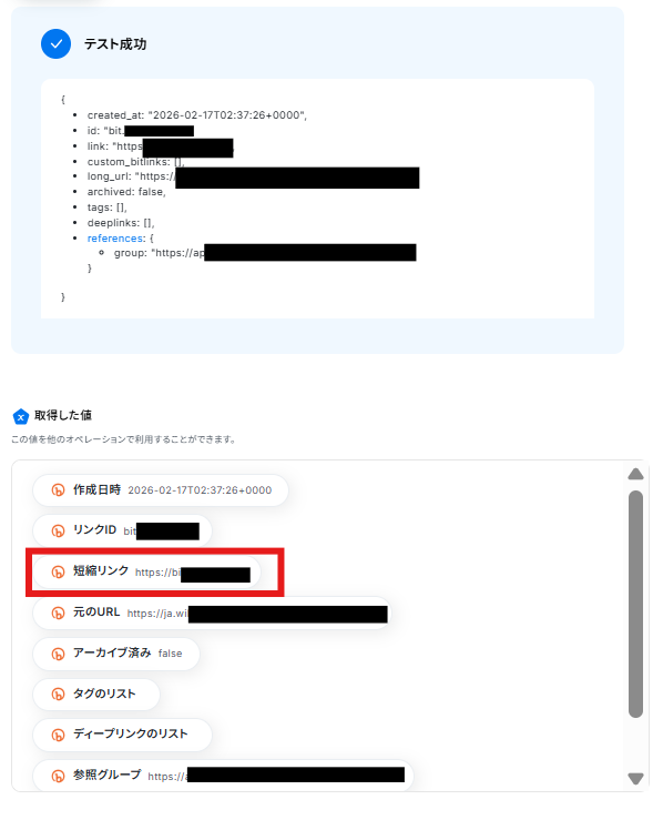 ここまで設定したらテストボタンをクリックしてください。 テストが成功し、取得した値に「短縮したURL」が入ればOKです。
